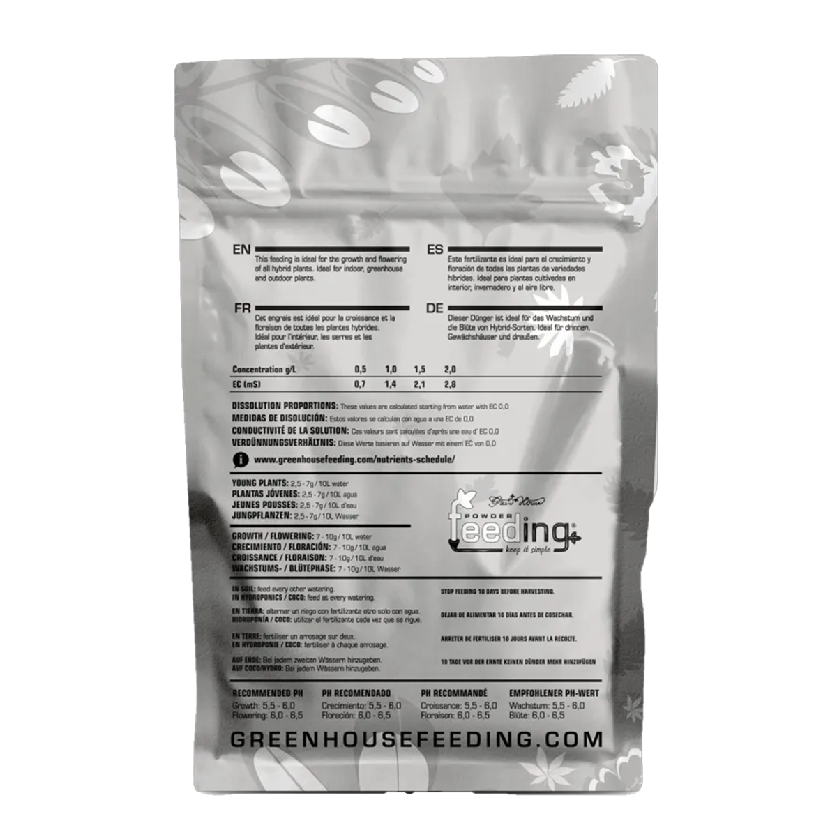 The Hybrids feeding contains less ammoniacal nitrogen and higher amounts of magnesium which is beneficial for Hybrid varieties with a flowering time of 8-10 weeks and plants grown in hydroponic systems.The higher amount of magnesium and sulfate stimulates the production of essential oils, terpenes and flavonoids.